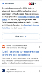 Reddit appears first in the SERP, ahead of The Guardian, for ‘best sunscreen 2026’